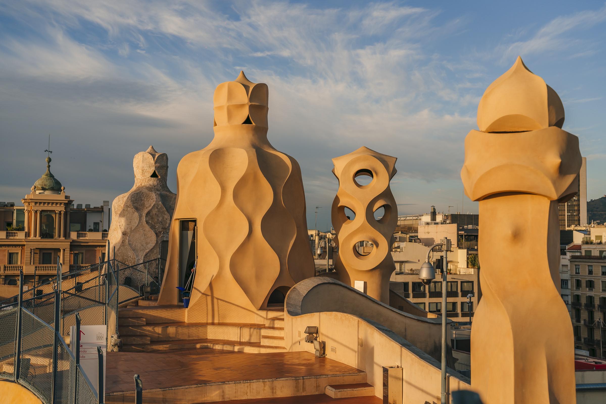 An emblematic rooftop with 360º panoramic views over Barcelona. The chimneys, ventilation towers and stairwells follow the undulating rhythm of the façade. Its symbolic forms, treated with trencadís mosaic of ceramic, stone or glass, combine beauty and function in a unique, vibrant space.