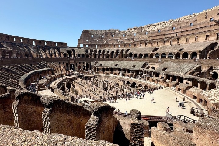 地下の奥深くから出て、コロッセオの見学はアリーナの床へと続きます。ここは、ライオン、クマ、その他の野生動物、そして剣闘士たちが運命に立ち向かわなければならなかった場所です。